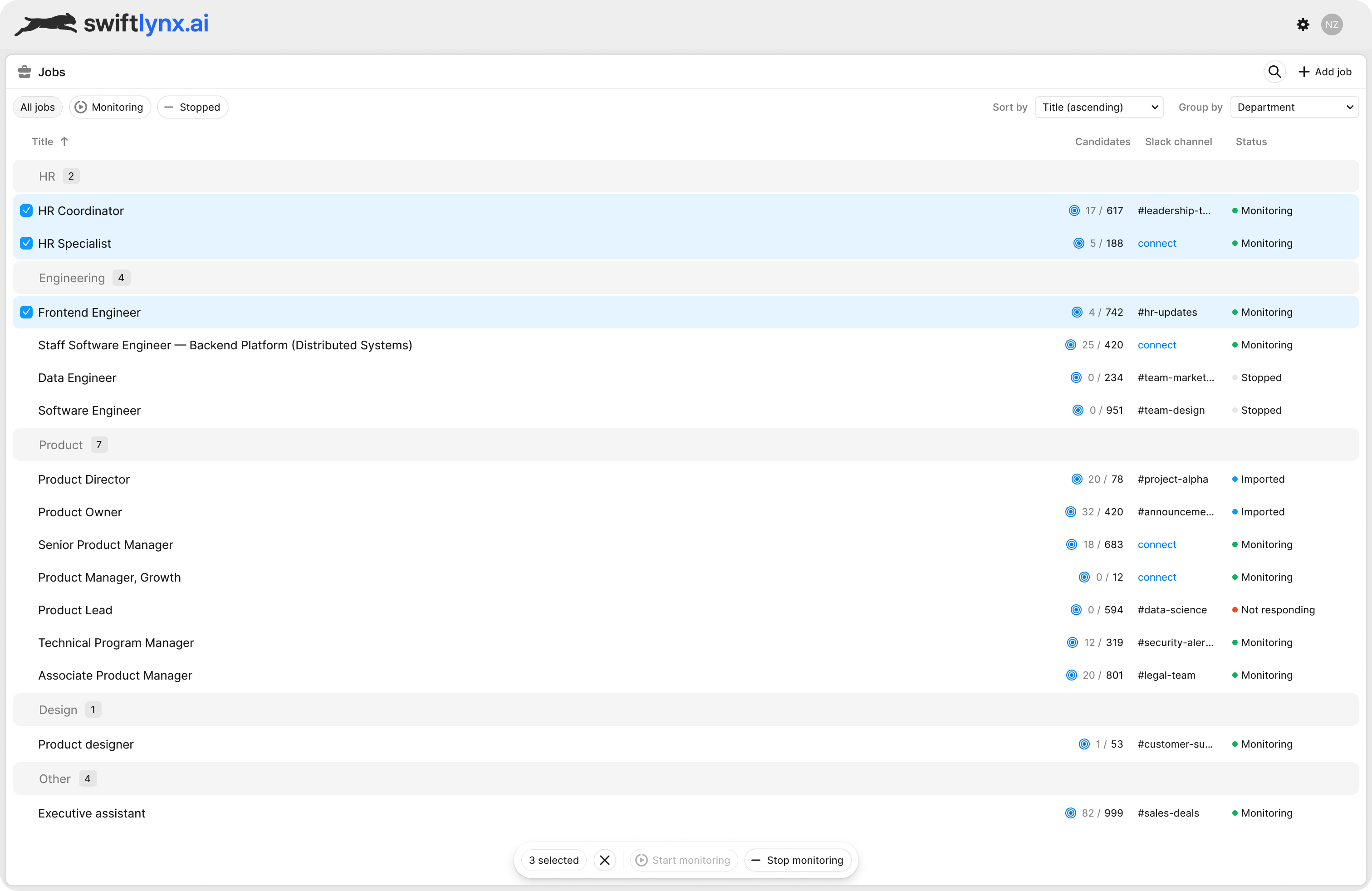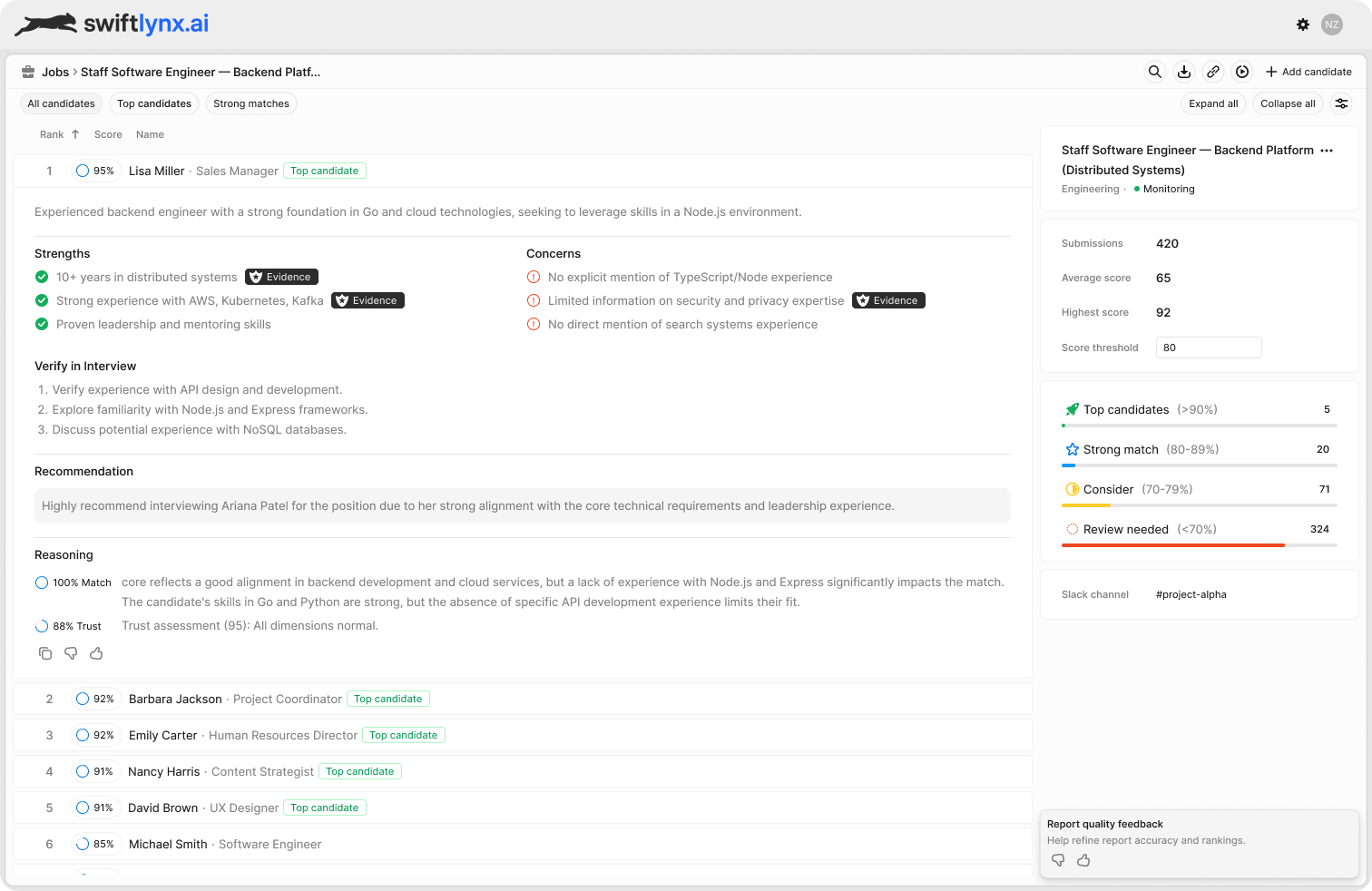 See ranking, shortlist quality, and job status in one view.